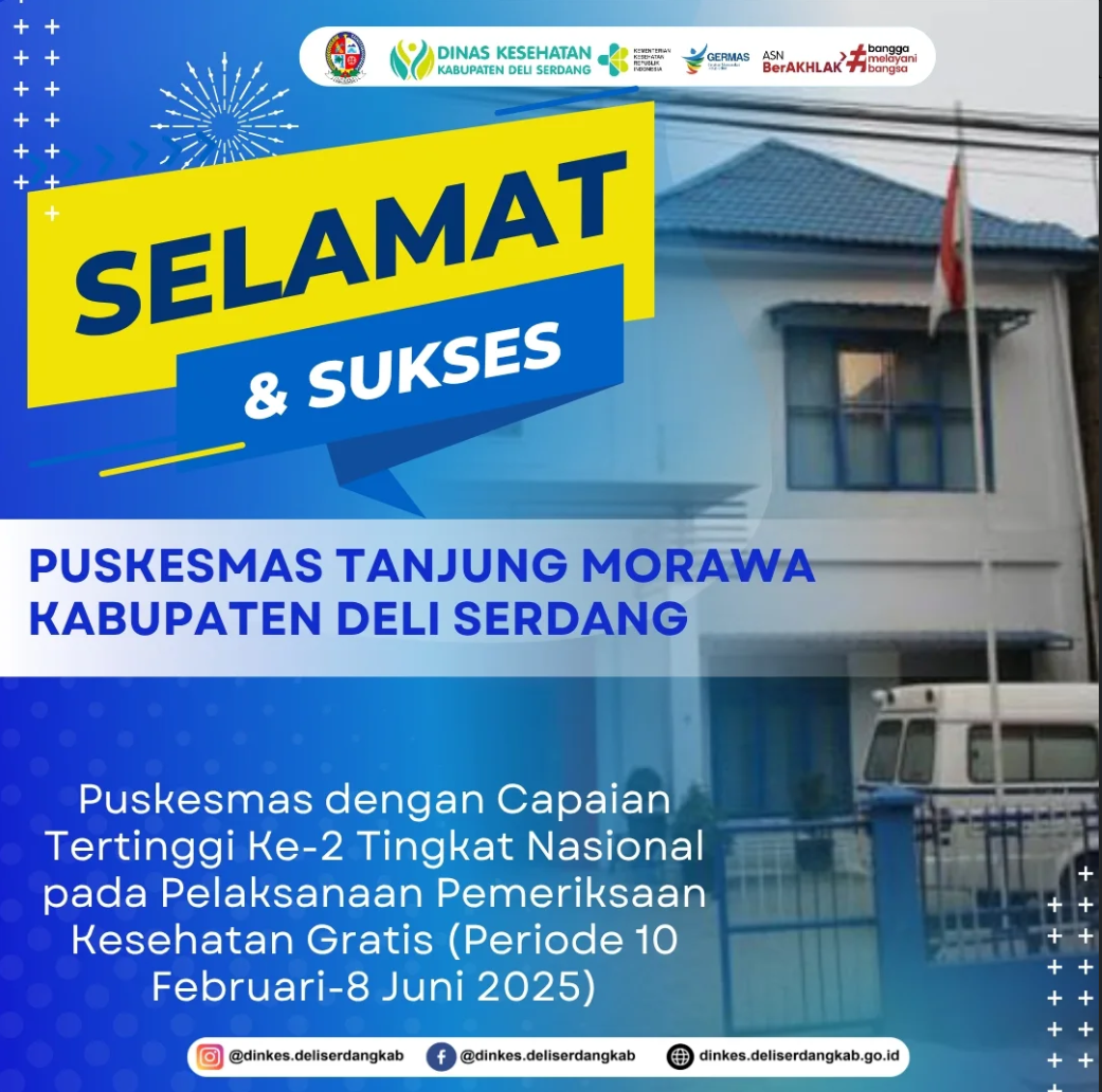 Kami ucapkan selamat kepada Puskesmas Tanjung Morawa, Kabupaten Deli Serdang atas pencapaian luar biasa sebagai Puskesmas dengan Capaian Tertinggi Ke-2 Tingkat Nasional dalam pelaksanaan Pemeriksaan Kesehatan Gratis pada periode 10 Februari – 8 Juni 2025